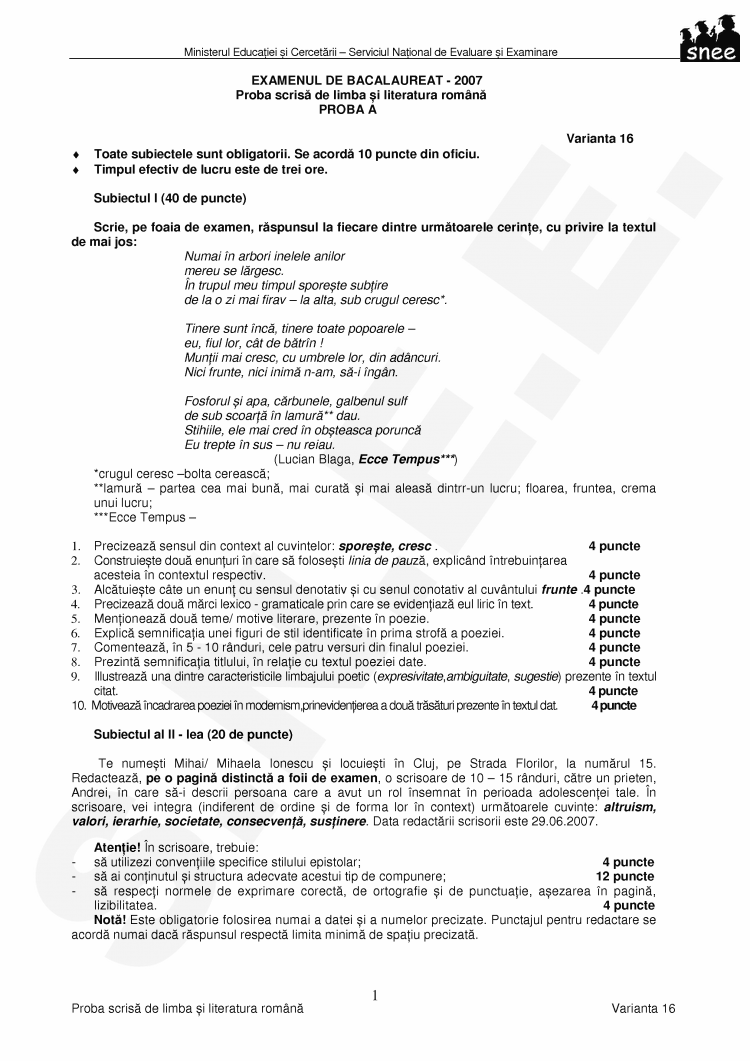 • Toate subiectele sunt obligatorii. Se acorda 10 puncte