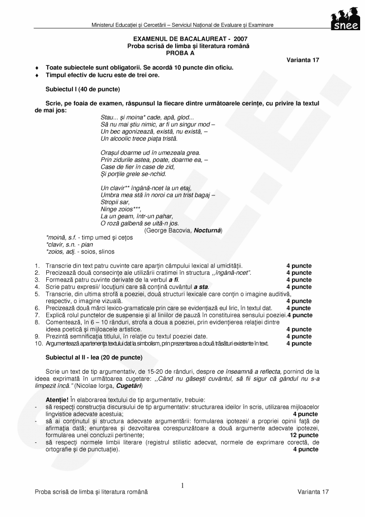 3 puncte; abilitati de analiza si de argumentare - 3 puncte;