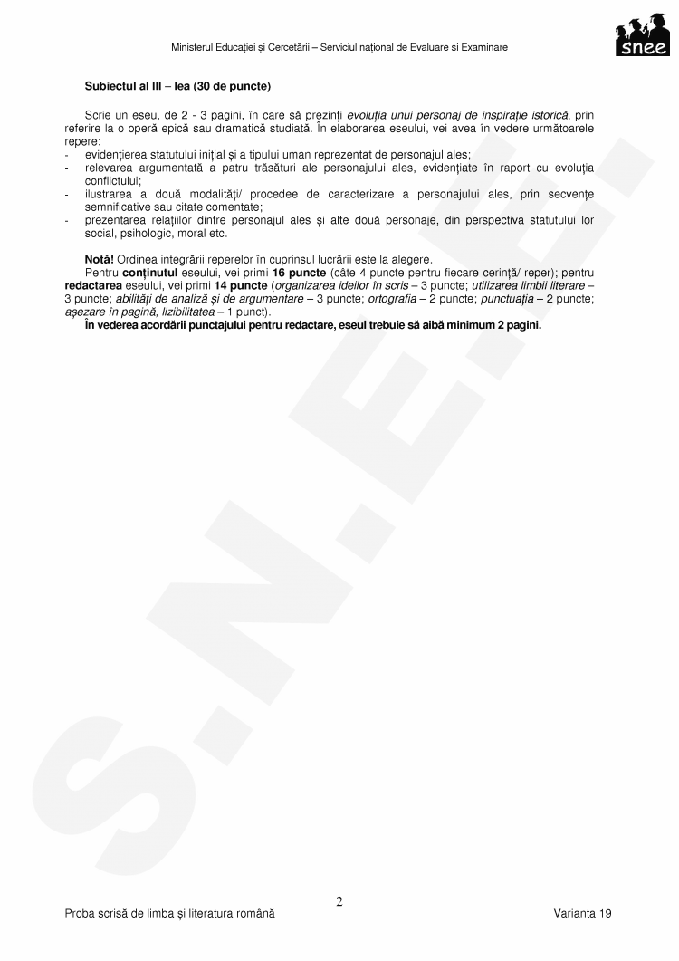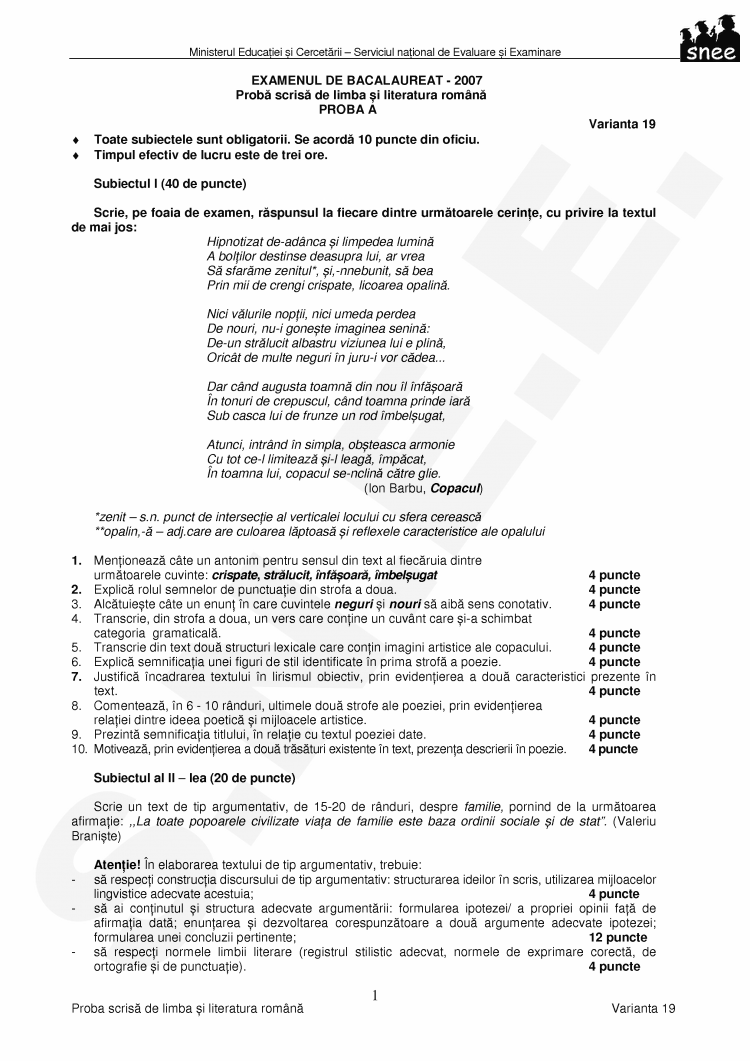 3 puncte; abilitati de analiza si de argumentare - 3 puncte;