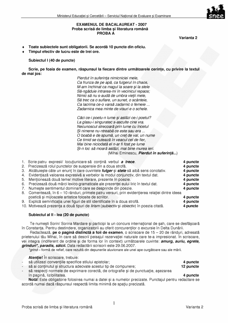 • Toate subiectele sunt obligatorii. Se acorda 10 puncte
