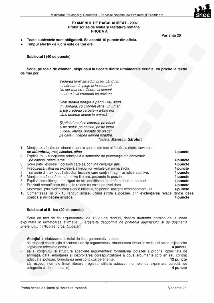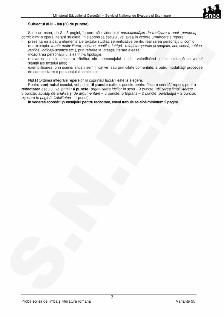 3 puncte; abilitati de analiza si de argumentare - 3 puncte;