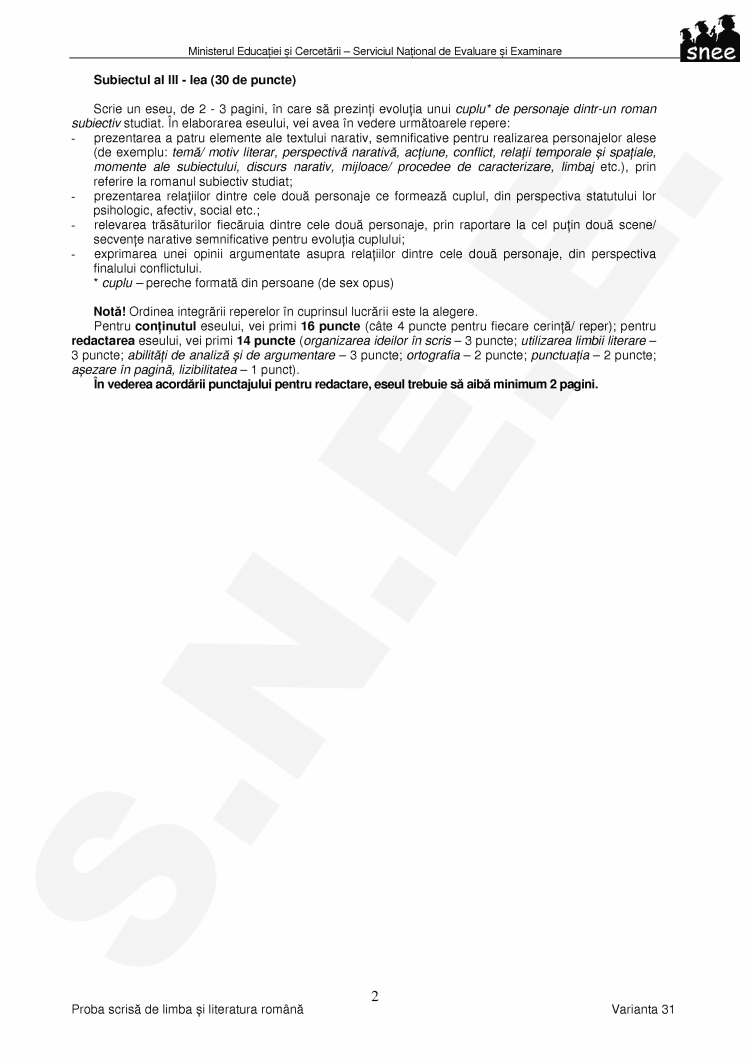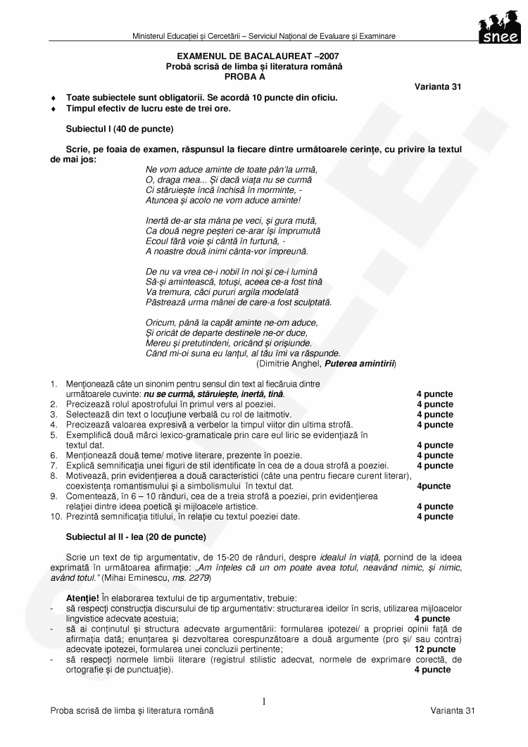 3 puncte; abilitati de analiza si de argumentare - 3 puncte;