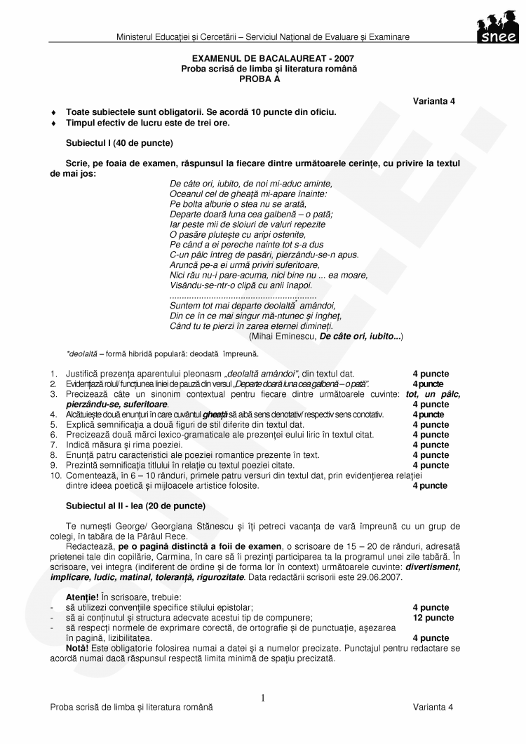 • Toate subiectele sunt obligatorii. Se acorda 10 puncte