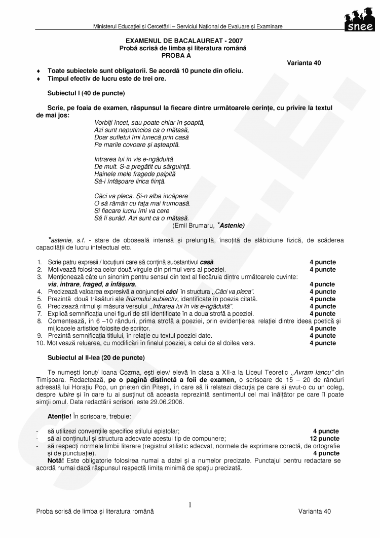• Toate subiectele sunt obligatorii. Se acorda 10 puncte