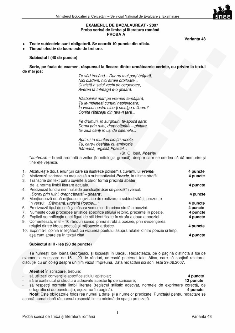 • Toate subiectele sunt obligatorii. Se acorda 10 puncte