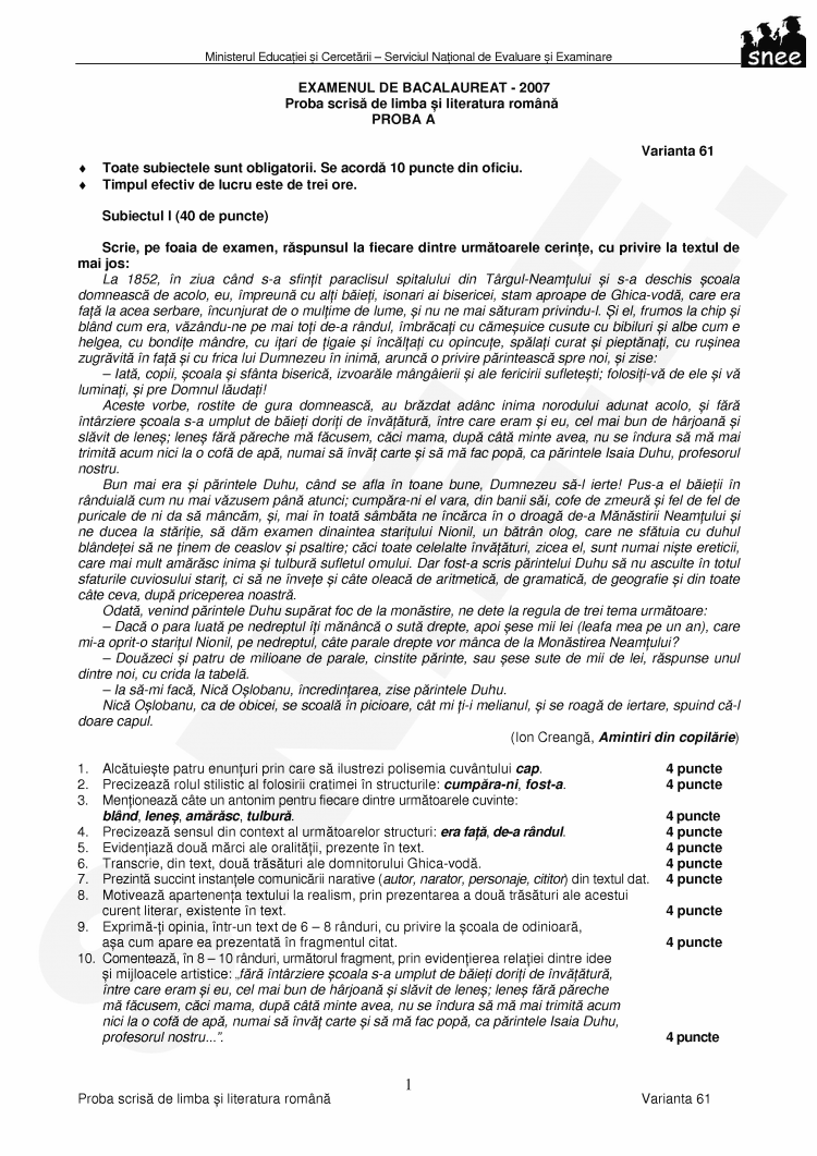 EXAMENUL DE BACALAUREAT - 2007