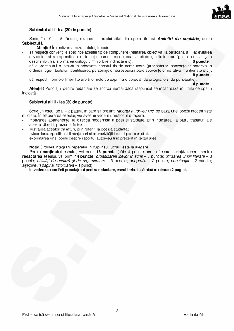 Atentie! Punctajul pentru redactare se acorda nurnai daca