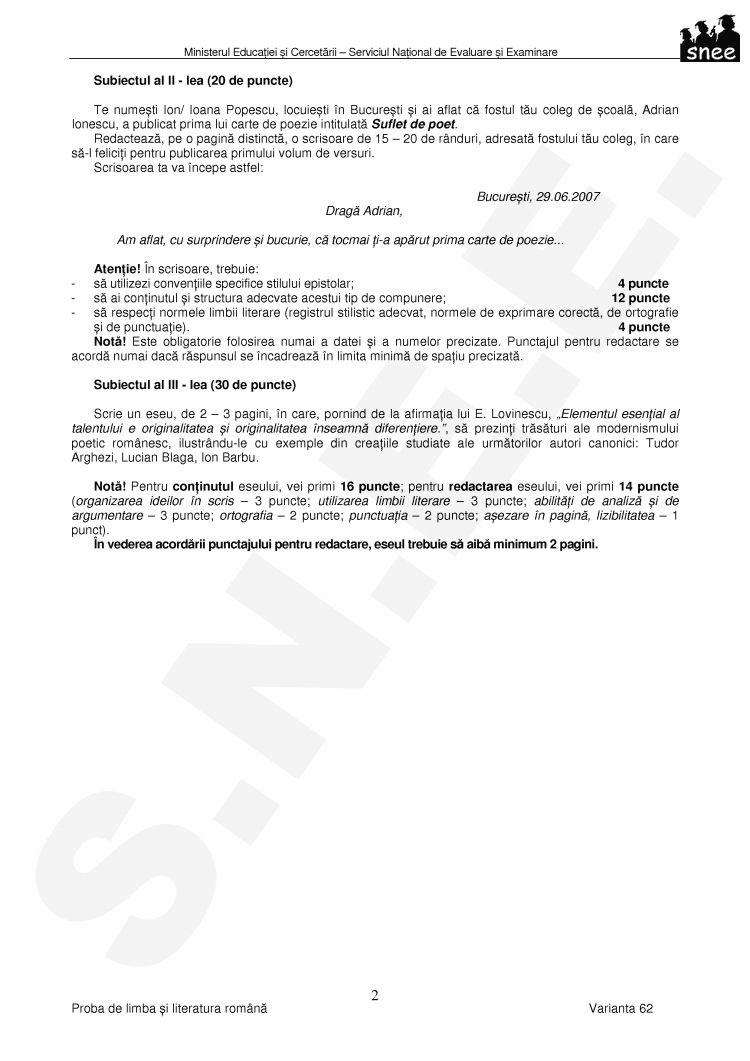Nota! Pentru continutul eseului, vei primi 16 puncte; pentru