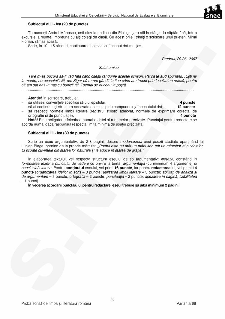 Proba scrisa de limba si literatura romana