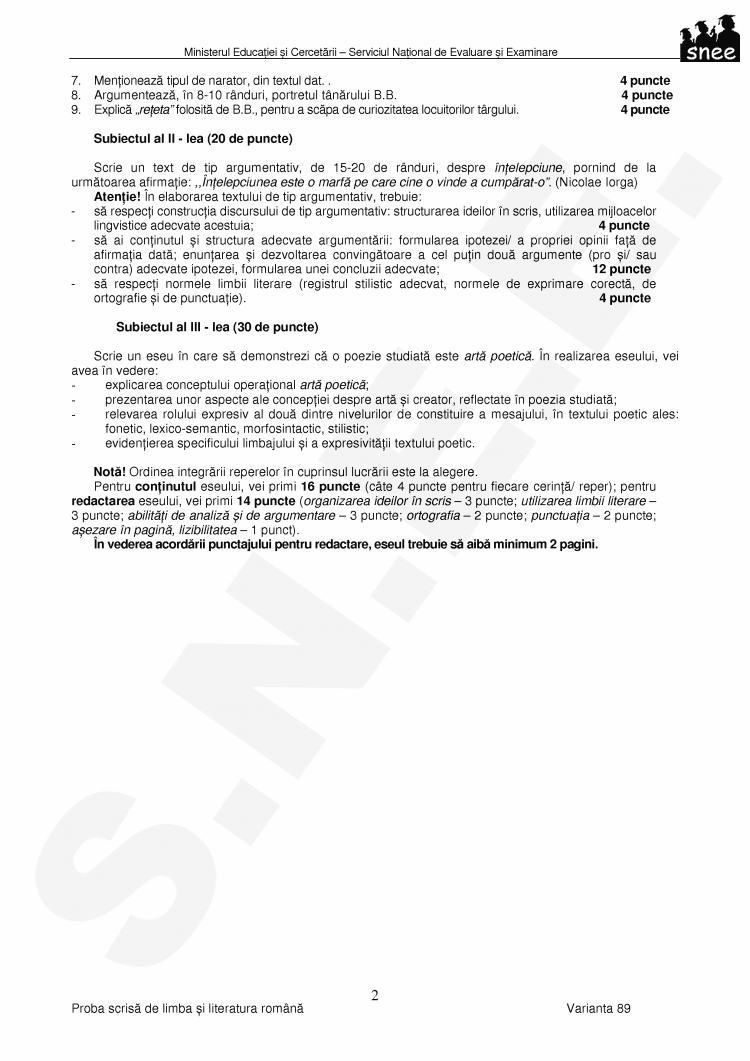 3 puncte; abilitati de analiza si de argumentare - 3 puncte;