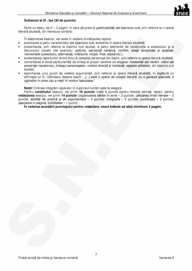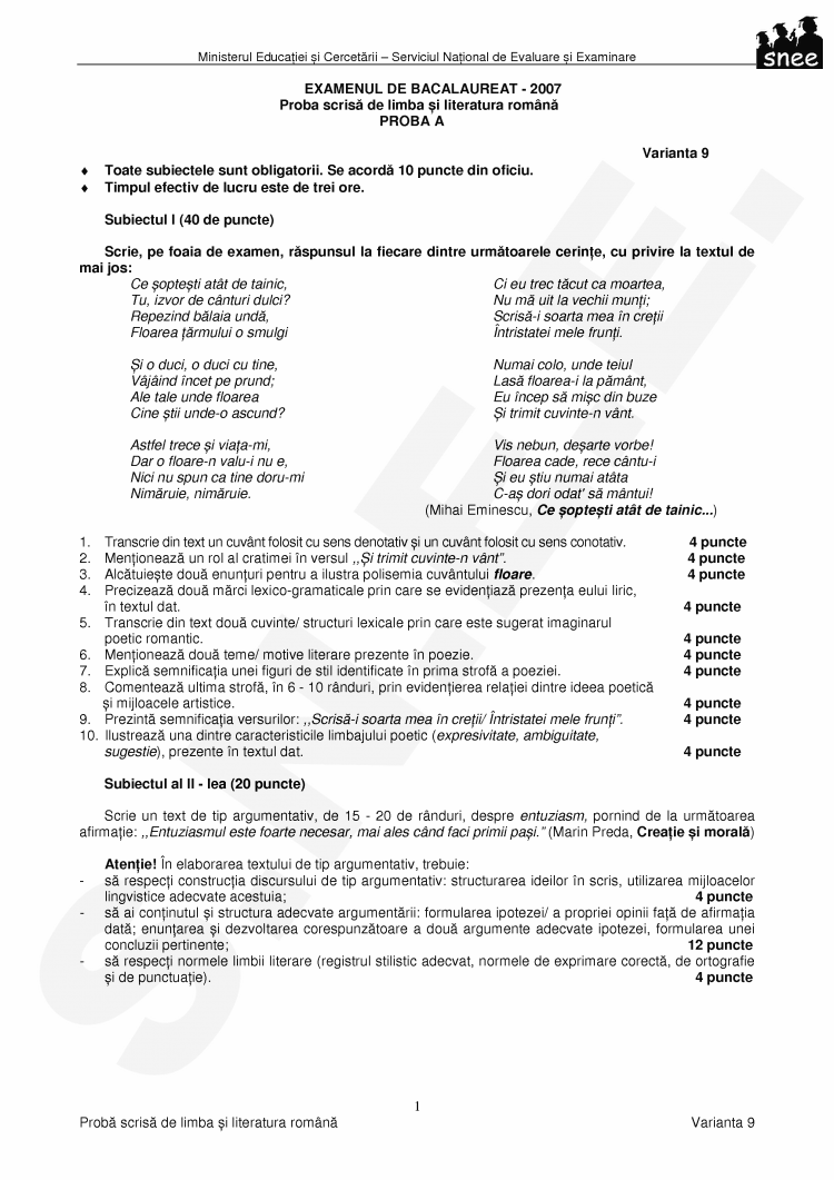 puncte; abilitati de analiza si de argumentare - 3 puncte;